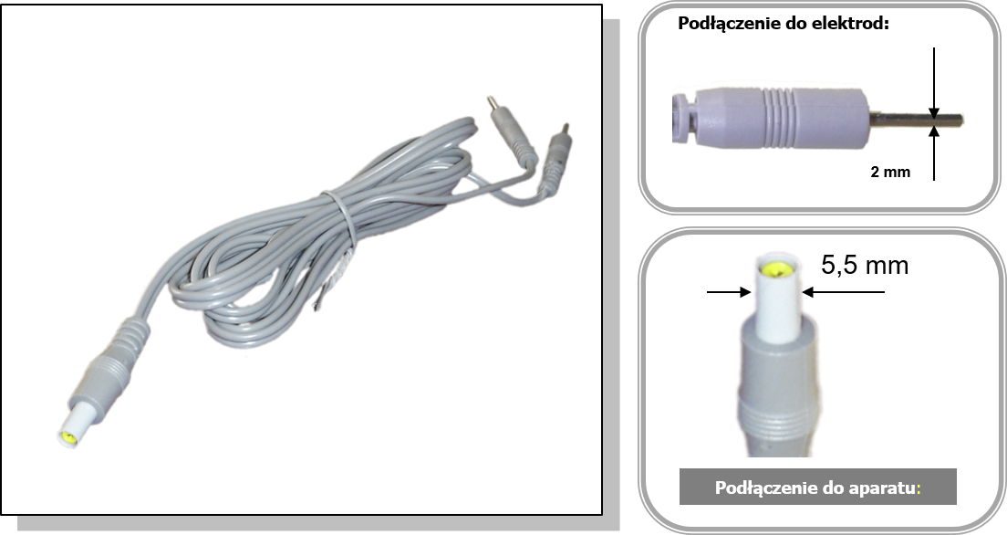 - Podłaszenie do elektrod: 2 złącza typu PIN – 2 mm.